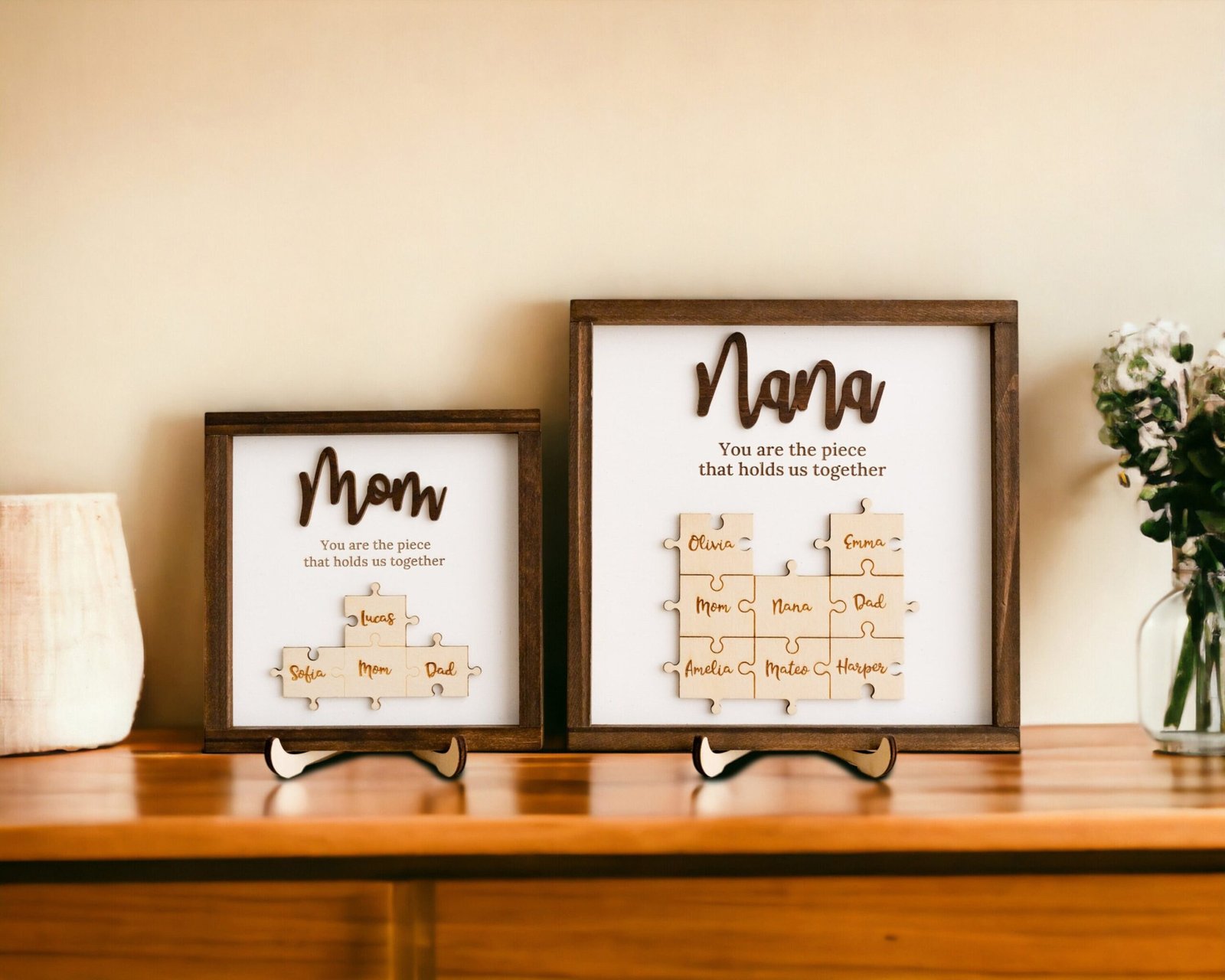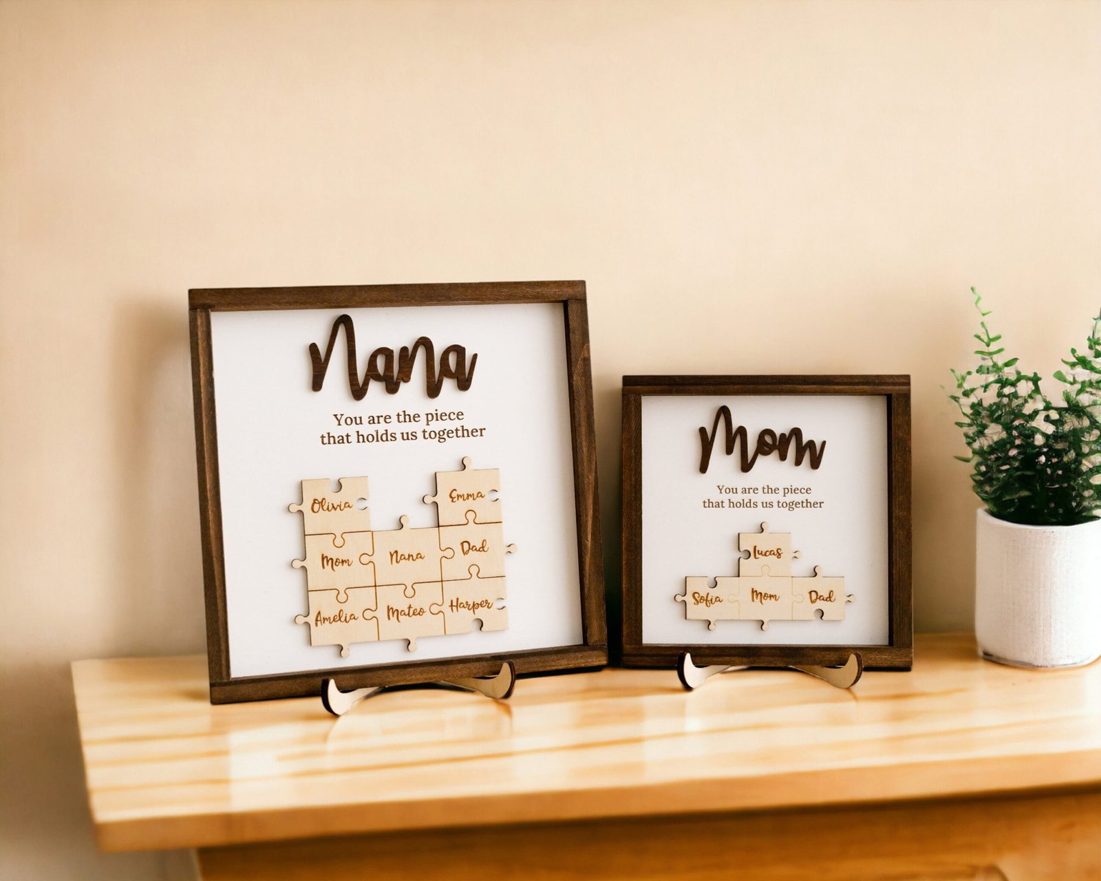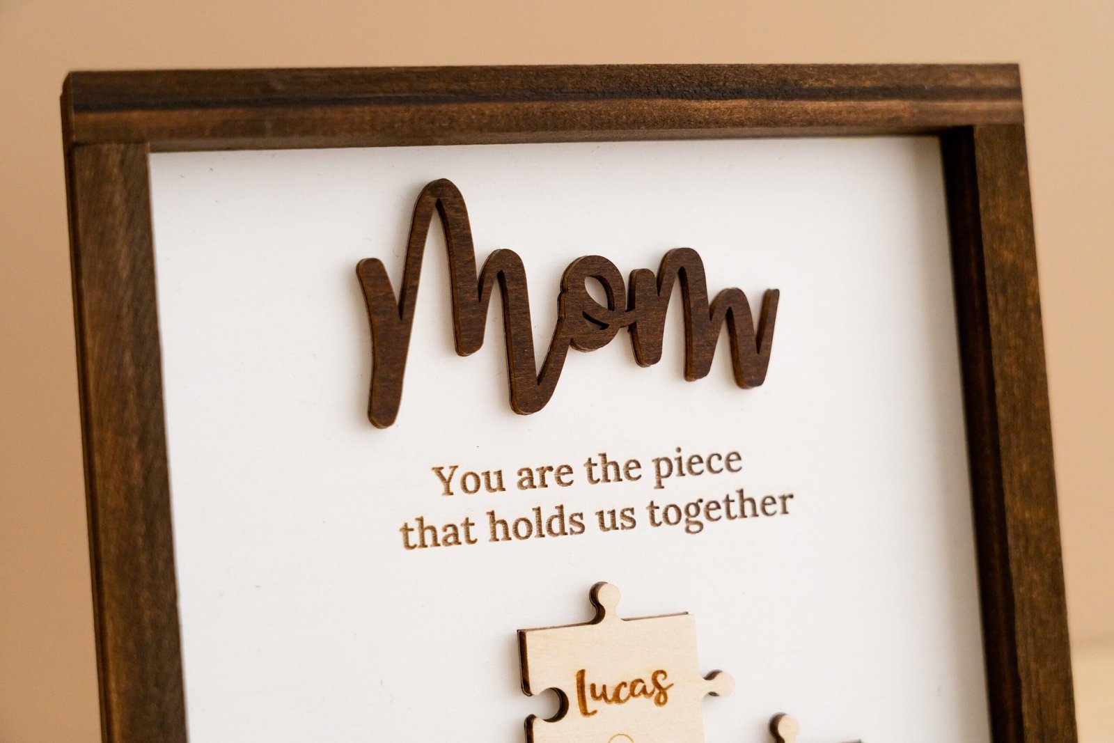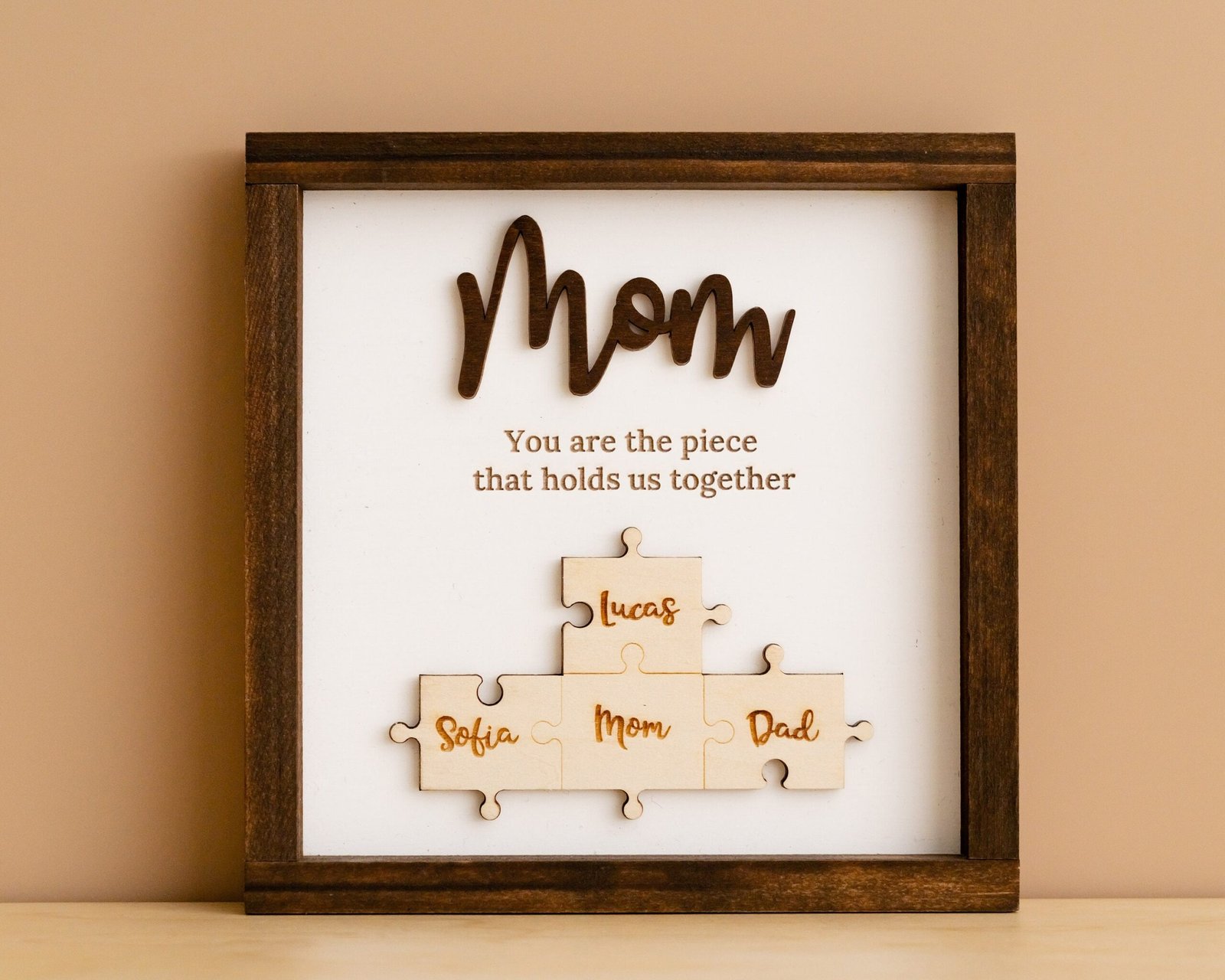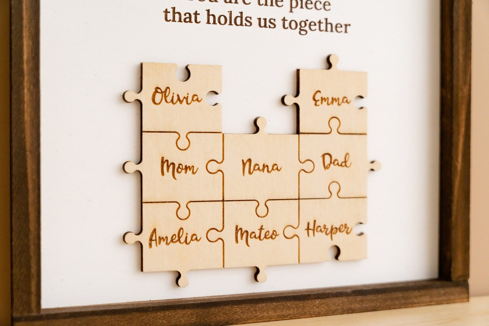 - 💬 Heartfelt Engraved Message The touching phrase “You are the piece that holds us together” is deeply engraved on the faux shiplap background, adding a meaningful layer of emotion to the overall design.